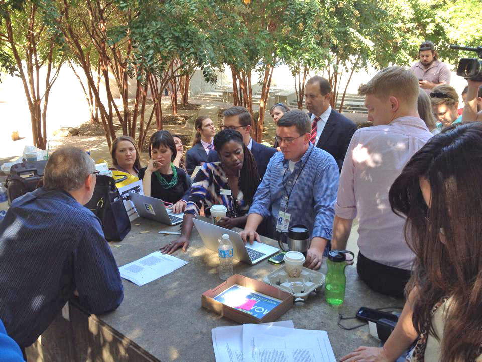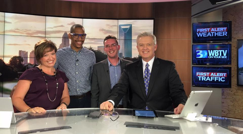 From left: On stage at the Charlotte Pride Festival and Parade; Talking LGBTQ history and current events with Mike Collins and WFAE's Charlotte Talks; Awaiting breaking news from the Fourth Circuit Court of Appeals on marriage equality rights in 2014.