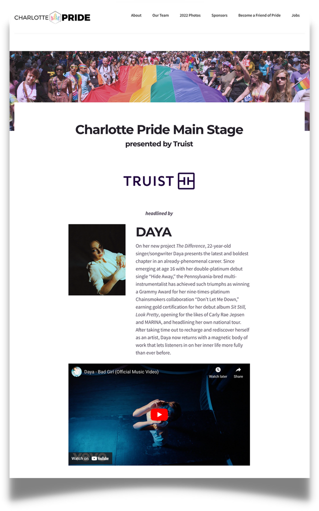 From conception to execution, I can design and produce a variety of communications products in print or other physical mediums. I'm most proud of the large-scale stage and other event banners I designed for Charlotte Pride's new logo and branding, which were used for the first time in 2022 after a two-year pandemic hiatus put the event on hold. Project highlights on this page: